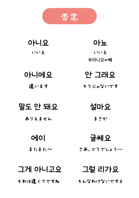 「いいえ」は아니요, 아뇨. 아닙니다など。아뇨は아니요の略です。タメ口は아니야(略は아냐)。아니에요は「違います」という意味。
